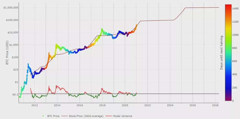 这也是比特币如此稀缺的原因,因此存量流量比模型试图根据这一事实预测比特币的价格。下图显示了比特币的价格随时间的变化,而存量流量线使用的是365天移动平均线来平滑因减半事件而产生的变化。