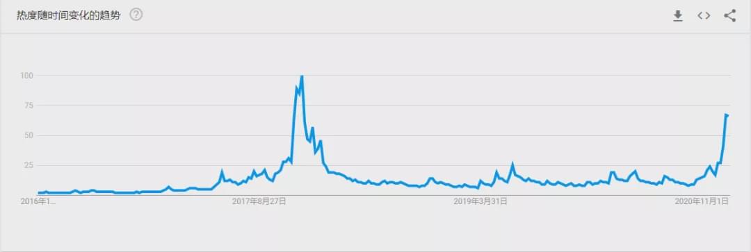 上图显示了谷歌的搜索兴趣,相对于过去5年图上的最高点。我们可以看到,目前的兴趣水平达到了2017年年底的峰值兴趣水平的75%左右。