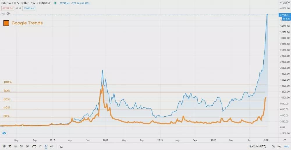 单从这张图上你无法得出太多关于比特币价格的信息,但比较两者的走势就会很有意思。我把上面的趋势提取了出来,并适当地将过去5年比特币的价格按比例放大到你下面看到的图表上。比特币的价格用蓝色绘制,谷歌趋势相对利益则用橙色绘制。