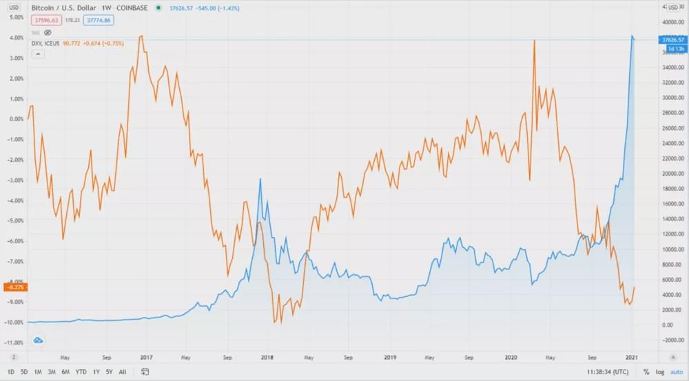 在下图中,蓝色的为BTC价格,橙色的为DXY价值的相对变化。在2017年底和2021年初的两个历史高点,你可以看到随着DXY的价值下降,BTC的价格均在上升。当然,这里还有很多其他因素在起作用,但这是其中一个有趣的因素。