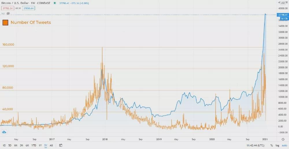 Twitter拥有约3.3亿用户,每天大约有5亿条推文发送。与谷歌趋势类似,我们不能直接从这一指标中获得很多价格信息。然而,这是另一个有趣的比较,以衡量兴趣水平,而这对价格的影响程度则取决于许多其他因素。
