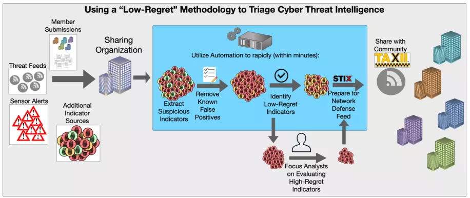 对这种提取应用“无悔”策略的核心原则是“潜在恶意指标”,许多信息共享机制未能在可采取行动的时间范围内提供数据,因为它们希望在共享数据之前无可辩驳地证明IOC是恶意的。但是做出这一决定的时间通常比网络攻击者积极使用IOC的时间还要长。因此,识别潜在恶意指标的过程必须自动化,并利用可重复的编码步骤来确定潜在恶意指标。这并不意味着忽略所有其他数据,因为这是ISAC/ISAO内部额外情报处理能力的关键功能。