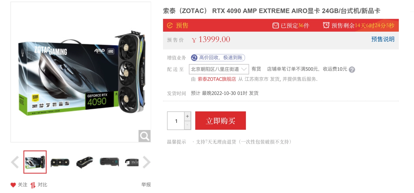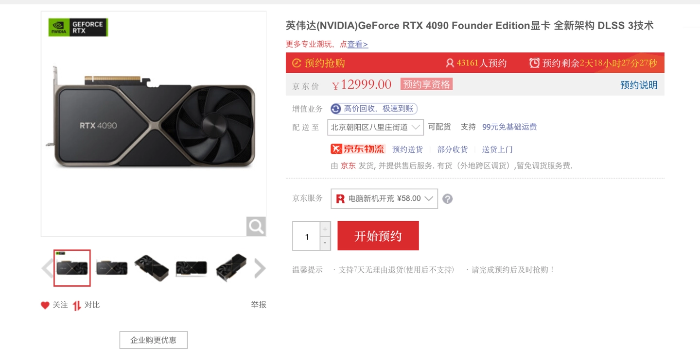 英伟达 RTX 4090 上架开售,首发秒罄。现在,各型号 RTX 4090 开启了预约和预售活动,公版型号将在 10 月 16 日开售,预约人数超 40000。