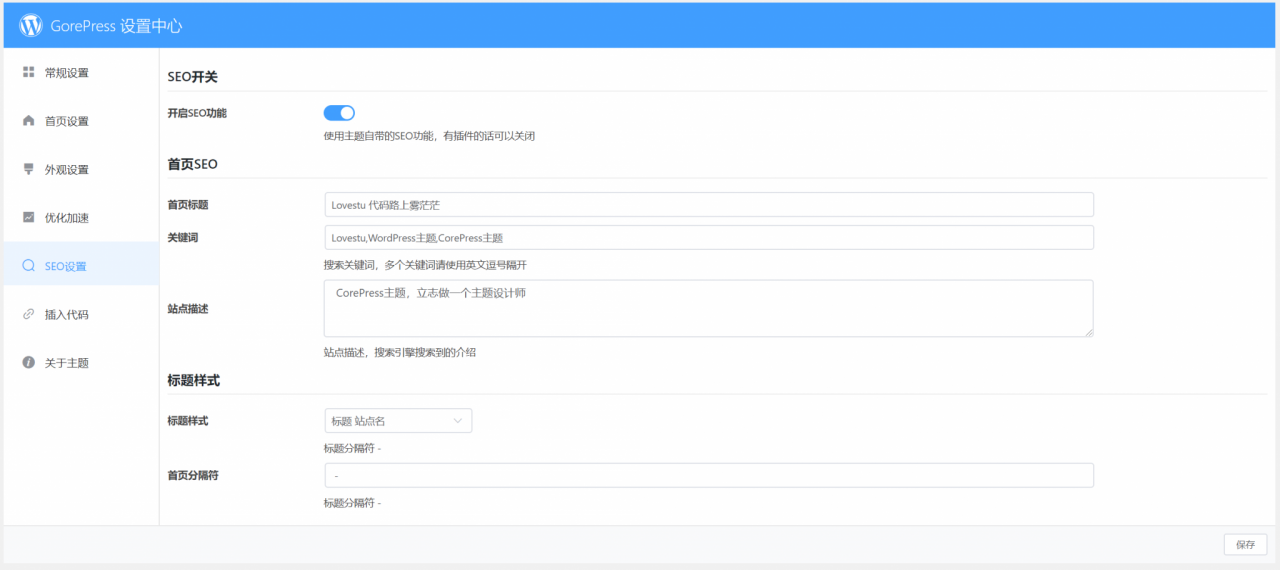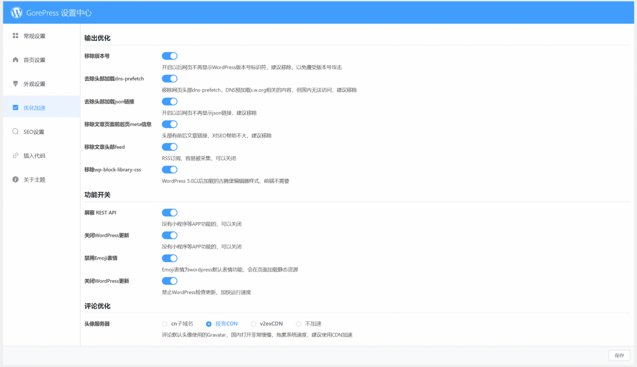 另外,对于WordPress,也提供了很多的优化,屏蔽了WordPress很多无法使用的功能,并且后台提供了详细的设置功能。