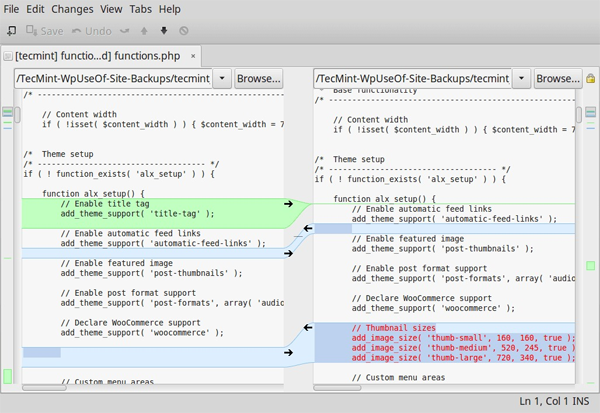 Diffuse是另一款流行、免费、小巧而简单的GUI比较和合并工具,你可以在Linux上使用。它用Python编写,提供了两大功能:文件压缩和版本控制,以便编辑文件、合并文件以及输出文件之间的差异。