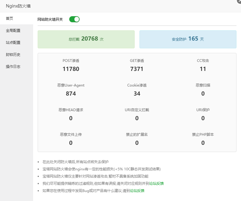 他会主动防御CC攻击与post渗透和get渗透,而且还可以手动添加封禁IP。如果你使用火车头大量的采集文章主动上传,防火墙甚至会屏蔽你的IP,你不得不登录防火墙后台把自己的IP添加到白名单之中。这说明,宝塔面板的防火墙非常好用。