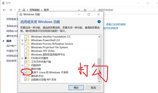 从弹出的对话框里,划到最下边,然后给“适用于Linux的Windows子系统“,打勾,完事!