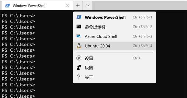 此时,神奇的事情发生了。在我们的Windows Terminal右上角,有一个向下的箭头,点击它,就可以看到刚刚安装的Ubuntu。