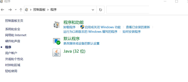 如下图,在控制面板,找到程序选项,点击 “启用或关闭Windows功能”。