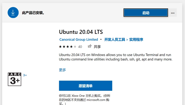 从应用商店安装Ubuntu系统,这个系统将会以软件的形式存在。我这里选择的是LTS版本,可以看到给它打分的人并不多,可能大多数都是像我一样没有微软账号的游客。