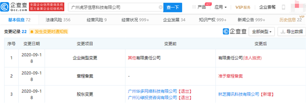 据企查查APP显示,9月18日,虎牙直播经营主体广州虎牙信息科技有限公司发生工商变更,原股东广州华多网络科技有限公司(欢聚时代关联公司)和广州沁绿投资咨询有限公司退出,新增林芝腾讯科技有限公司,持股100%。