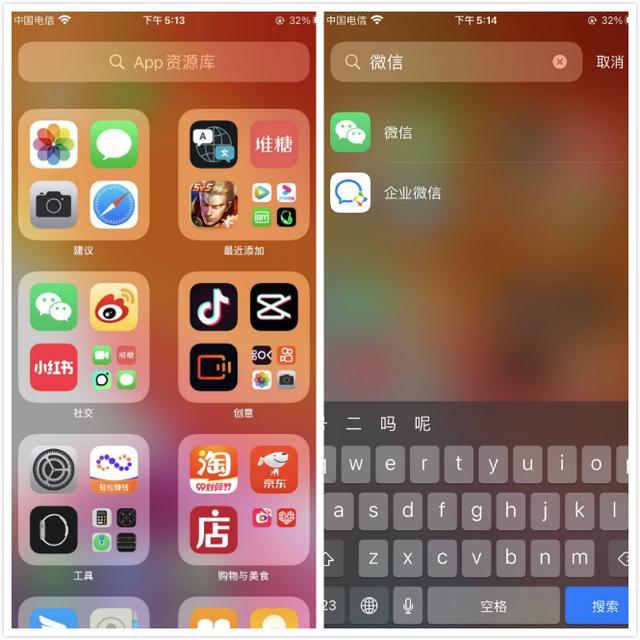 - 滑动主屏幕到最后一页,进入「App 资源库」,在这里所有APP按照功能自动归类。要快速找到你的目标APP,可以进入功能文件夹,也可以在搜索框直接搜索。即便手机装了上百款APP中,你都能在3秒内直达目标。