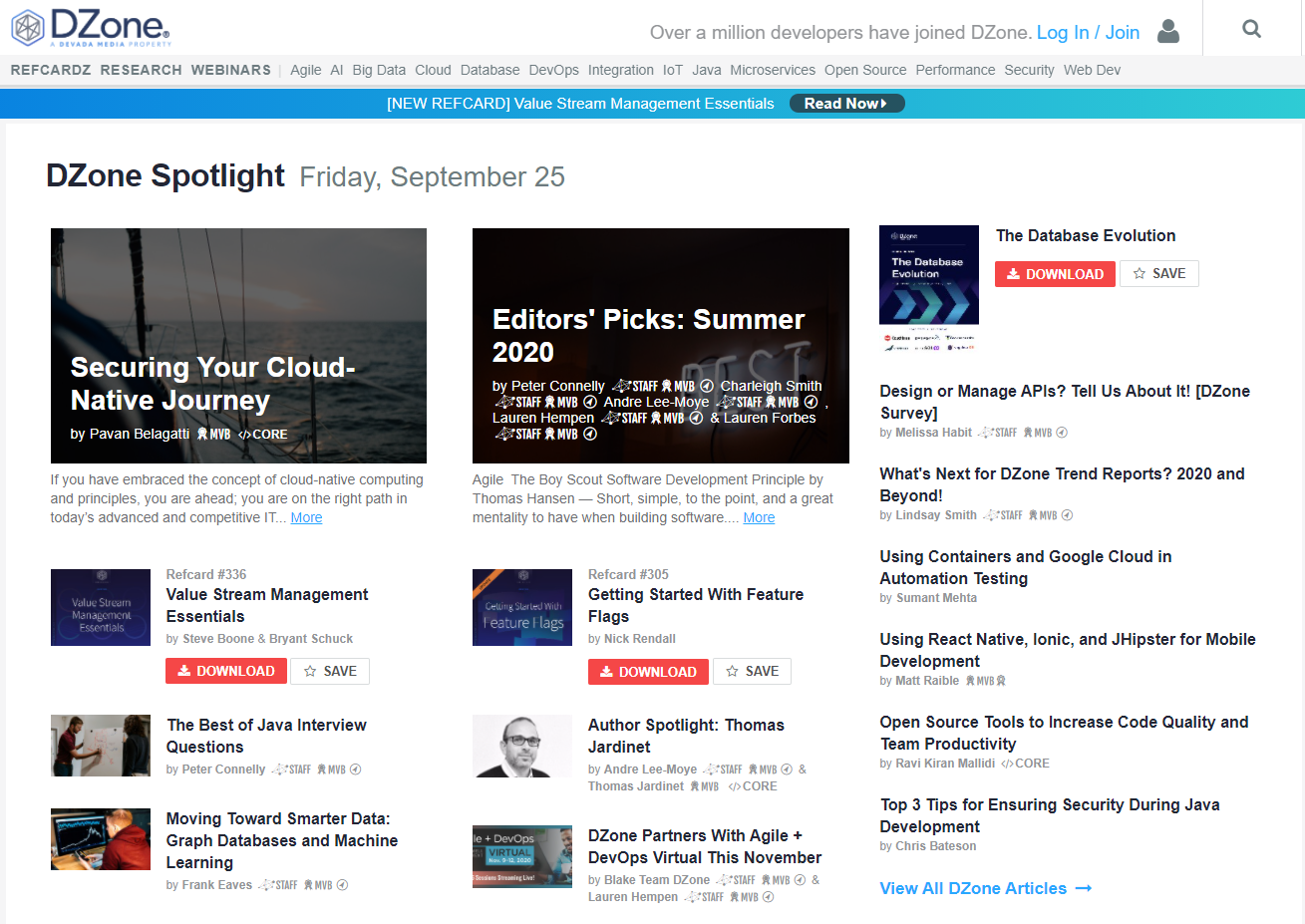 超过一百万的开发人员属于DZone,对于今天的编程专业人员和开发人员而言,DZone成为著名的编程新闻中心。该站点涵盖了从敏捷开发到云开发,大数据,集成,性能等等的所有内容。DZone是来自行业各个角落的最新见解的宝贵资源。