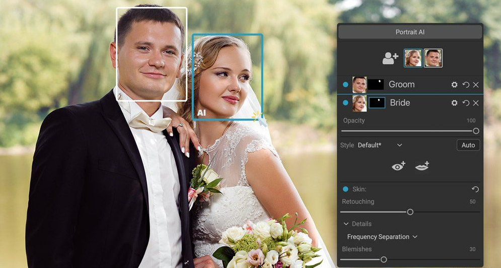 只需使用ON1 Portrait AI即可轻松完成修饰。它使用机器学习来自动查找照片中的每个面孔,