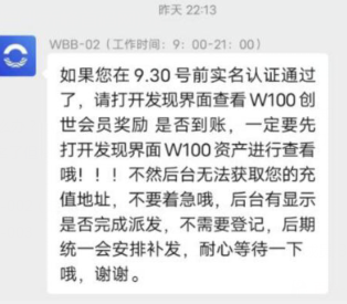 变现通知:9.30号前实名认证通过的50个已经发放了,现在1.45元一个(这两天一直在涨 卖不卖自己决定),去自己APP上看一下有没有币,APP里点“发现”—左上角切换到“W100”