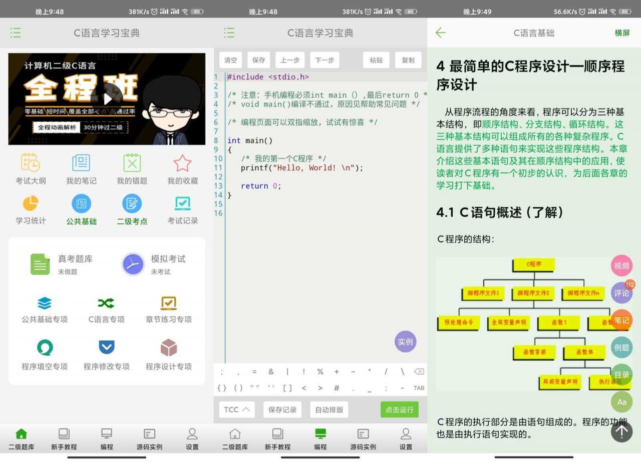 计算机二级和C语言编译器是本软件主打内容,让您一起学学习通C语言学习各阶段知识。软件首页就是计算机二级C语言题库,堪称计算机二级宝典。而C语言编译器是软件高级功能,是掌上编译和手机编程必备宝典。需要登陆解锁更多功能!