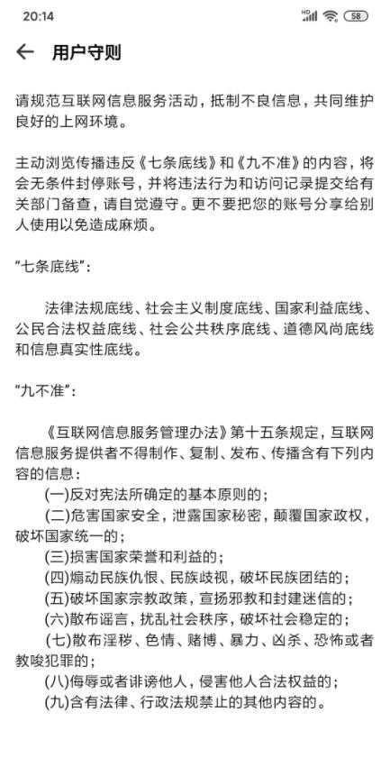 最后再说一点,该软件是很正规的,它已经屏蔽了不良网站及内容,并且用户在使用过程中好需要遵守「七条底线」和「九不准」的内容,如有违规,将会无条件封号,并将违法行为和访问记录提交给有关部门备查。