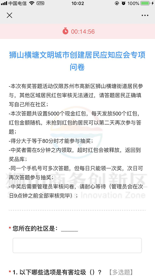须知:这个活动需要用:江苏省的IP 才可以参加,答题的时候社区名字不能乱填,必须要填写:狮山横塘街道的XX区,抽到红包不秒推