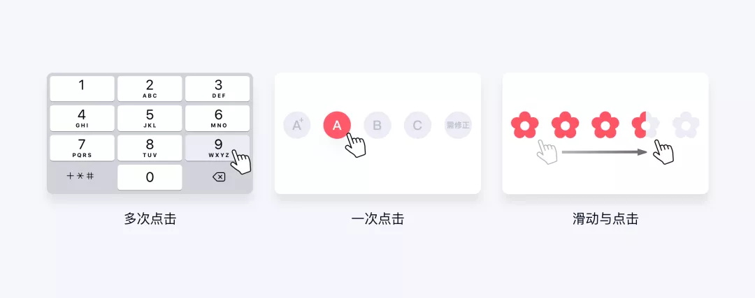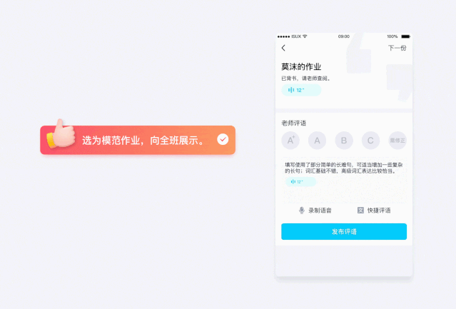 老师们的打分方式主要有:分数、ABC、优良中、小红花等,我们从最快速输入成本的角度,采用直接点选的体验方式,让老师可以一步选择相应的分值。