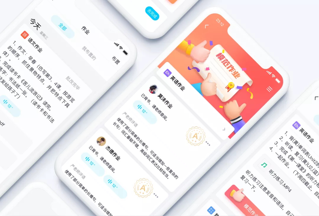 在视觉表现上也是尝试过一些与学习相关的元素来代表模范作业,最后选择点赞的手势作为模范作业的主元素,突出同学们之前相互学习,相互鼓励的正能量学习氛围。