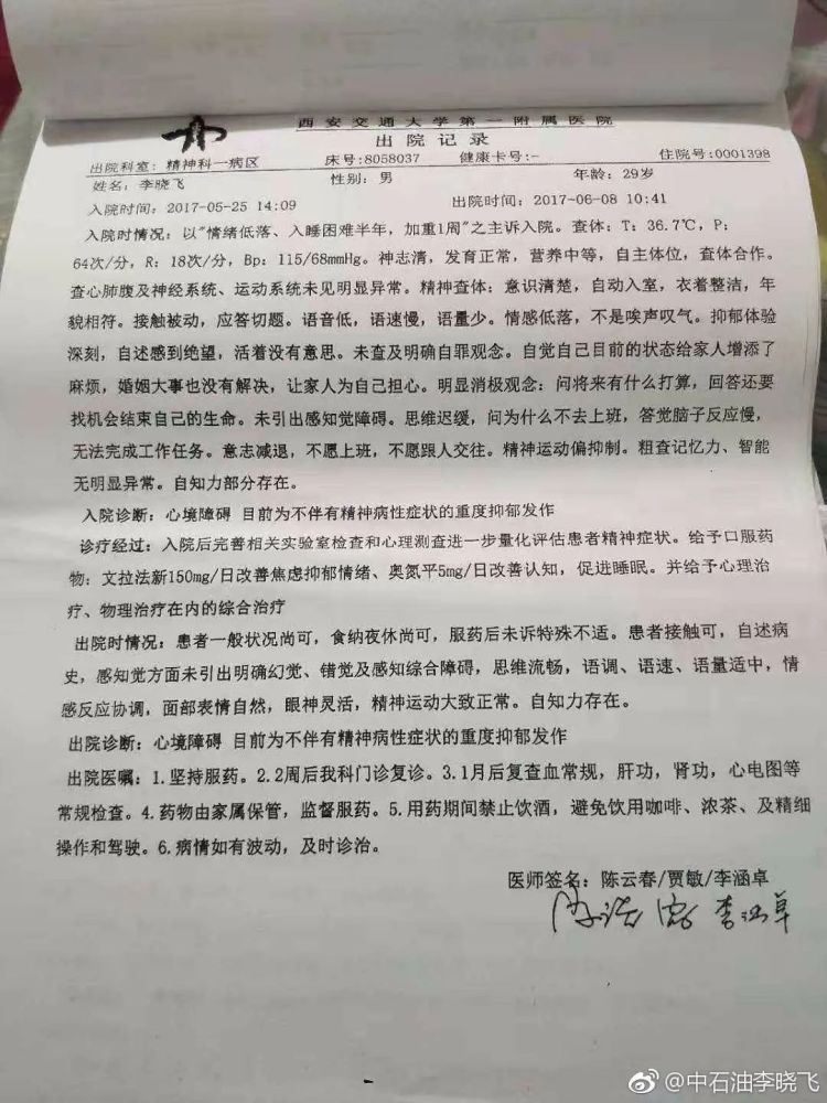 根据多份材料显示,自2016年开始,李晓飞多次在乌鲁木齐、西安等地入院接受治疗,诊断结果包括抑郁、偏执等问题。一份西部钻井公司发给李晓飞父母的告知书称,李晓飞在医院曾想用针头自杀。