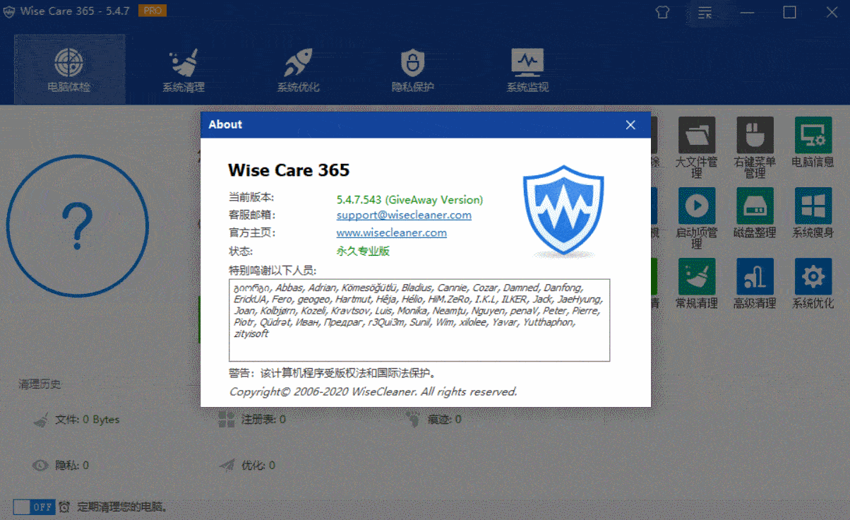 Wise Care 365 – 世界上最快的系统优化软件!它具有电脑体检、系统清理、系统优化、隐私保护、系统监视等功能,还可以精简系统、管理启动项,清理优化注册表;清理个人隐私数据,保护个人隐私;内置密码生成器,可根据一定条件生成密码;可选内存整理、文件粉碎、硬盘擦除、恢复丢失文件、计划任务关机、硬盘碎片整理等。利用此软件的系统清理功能,可以体验全世界最快的扫描速度,轻松加速您的系统!