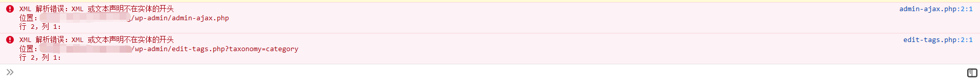 今天在测试wordpress的时候发现在添加分类的时候ajax失效了,浏览器f12查看提示“XML 解析错误:XML 或文本声明不在实体的开头”。如下图: