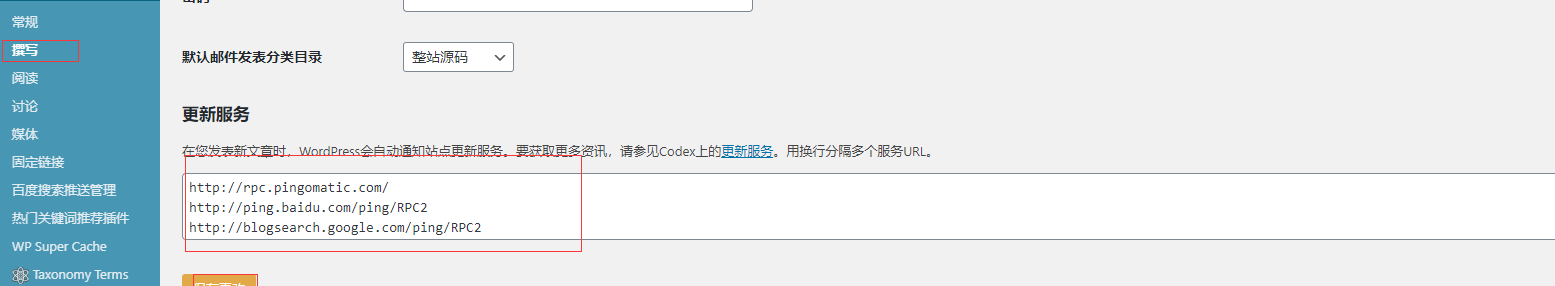 其实教程特别的简单,找设置-撰写-ping提交 一般有默认的rpc.pingomatic.com