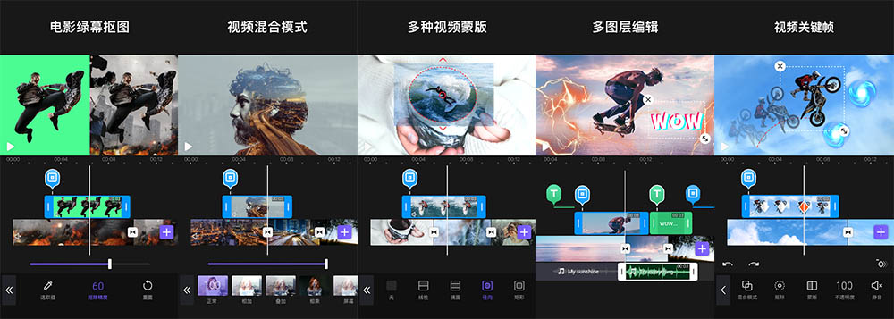 多层时间轴:直观,流畅的编辑界面,逐帧精确缩放,精确修剪影片。