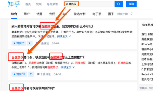 例如,用户在“知乎”搜索框中输入“百度热议”,综合排名如图所示。 那么,网站中的搜索排名因素是什么? 查看我圈子中的红色位置,以查看关键字是否匹配。