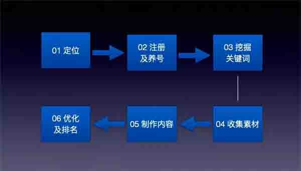 如图所示,了解排名步骤:定位-注册号码(很多人没有名字)-关键字挖掘-收集写作材料-进行内容优化排名,这是6个步骤。