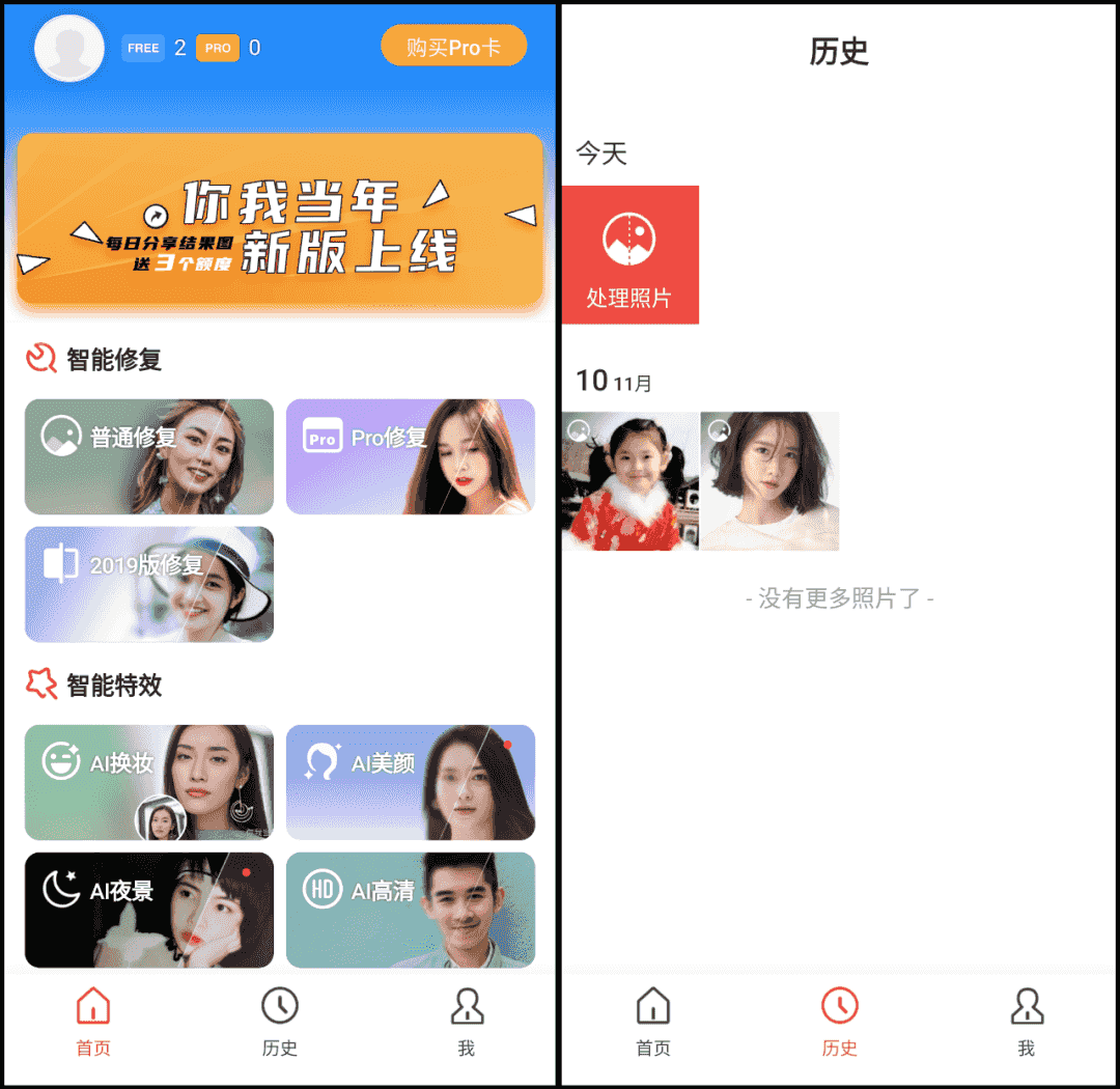 软件首页是功能界面,每一次使用的照片都会放在历史中,即使自己更换了设备。