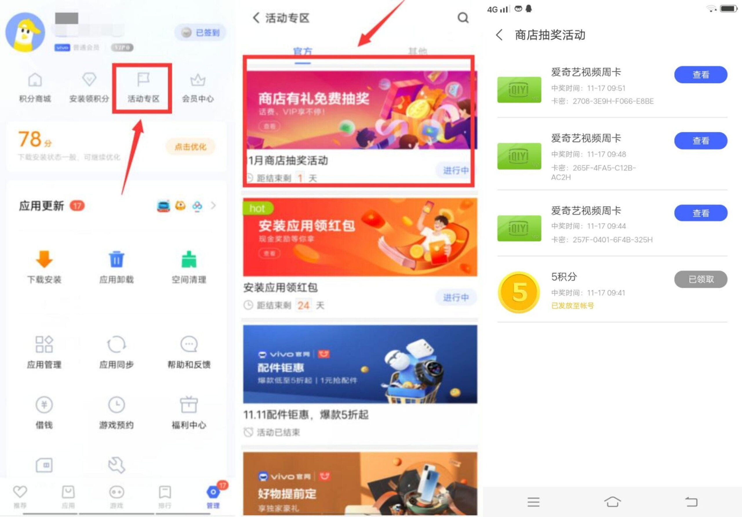 1、打开vivo应用商店->管理->顶部活动专区->商店有礼免费抽奖