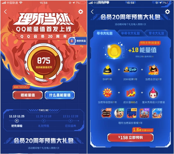 进去后小编看见了自己的能量值 还有20周年预售大礼包 有年卡礼包 半年卡礼包以及季卡礼包