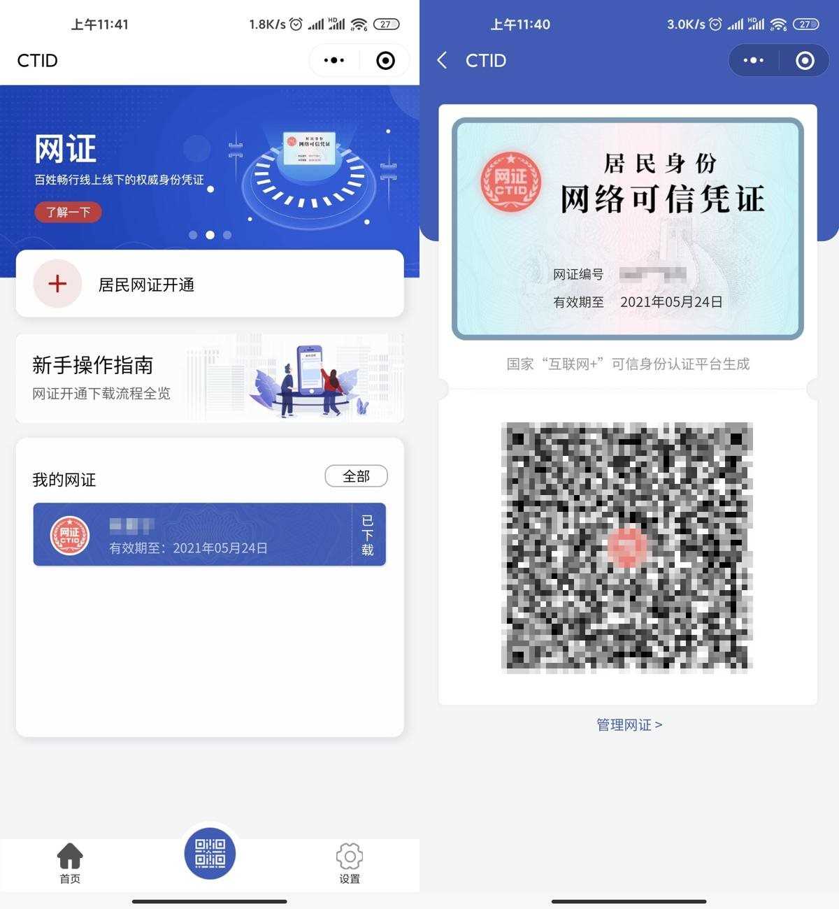 微信搜索小程序“我的CTID”即可办理,使用时,点击小程序主页的【我的网证】二维码就会弹出了。