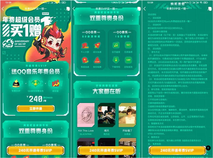 所以这次小编带大家来省钱了手Q打开链接 进入活动页面即可花240元开通QQ年费SVIP 然后活动还赠送年费QQ音乐会员