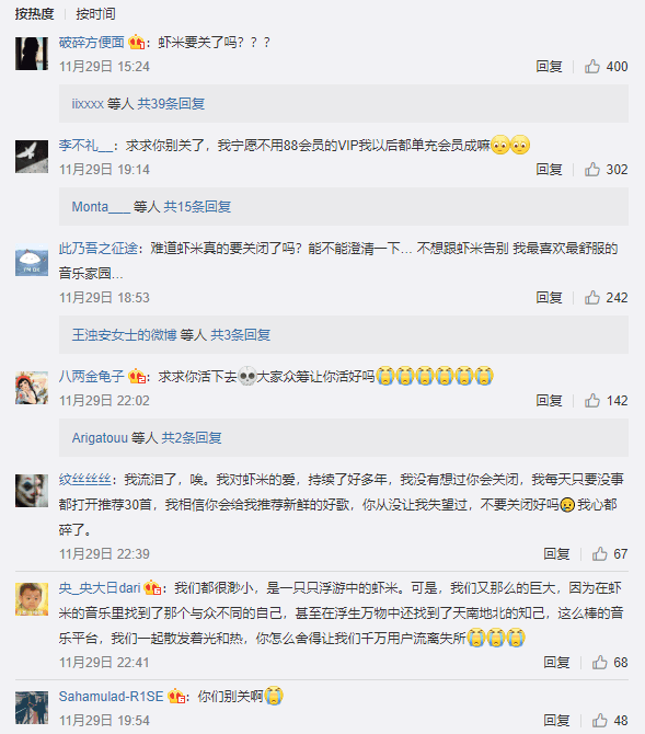 消息传出后,大量网友涌入虾米音乐官方微博留言,跪求不要关,但没有任何回应。