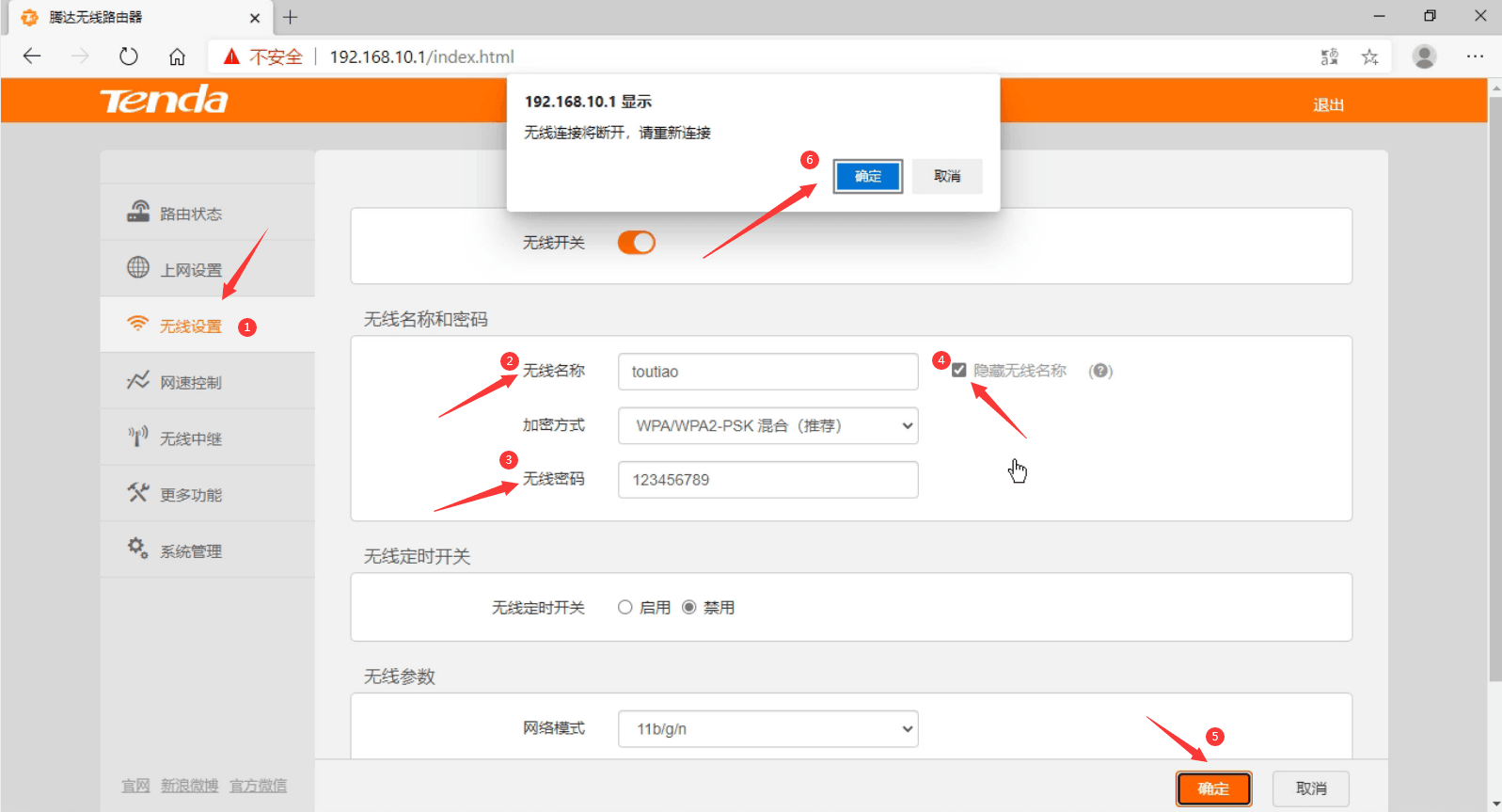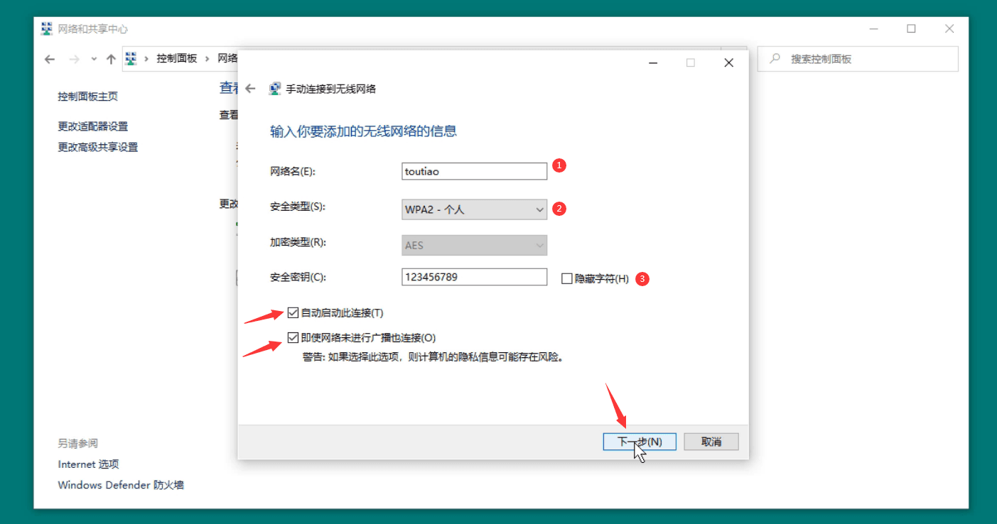 5、填写的网络名称就是我们刚刚设置无线名称:toutiao 安全类型一般都是:WPA2-个人 安全密钥填刚才设置的:123456789 下面的二个都勾选上,这样就成功添加了toutiao无线wifi了。