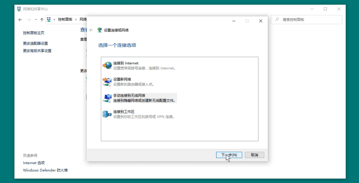 4、进入电脑桌面,windows系统,找到控制面板,点击网络和lnterne-网络和共享中心-设置新的连接或网络,然后手动连接到无线网络。