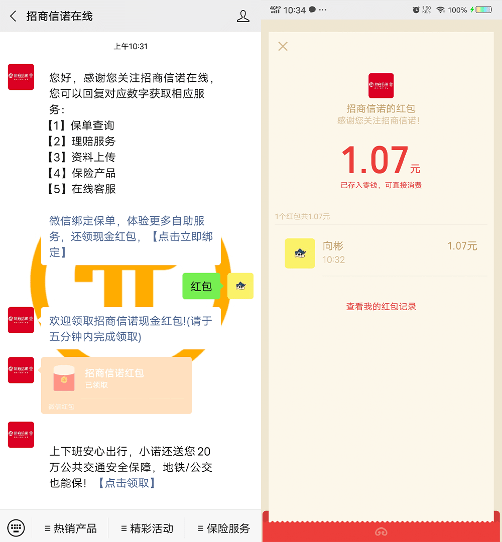 微信搜索关注:招商信诺在线 回复红包红包168红包来了红包秒到,赶紧不确定什么时候会被领完。