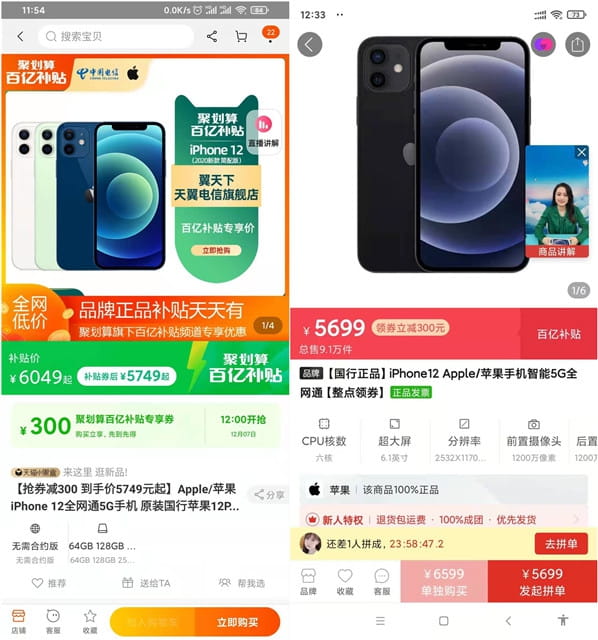 就以苹果12 64G来比较 淘宝售价5749元 而拼多多售价5399元