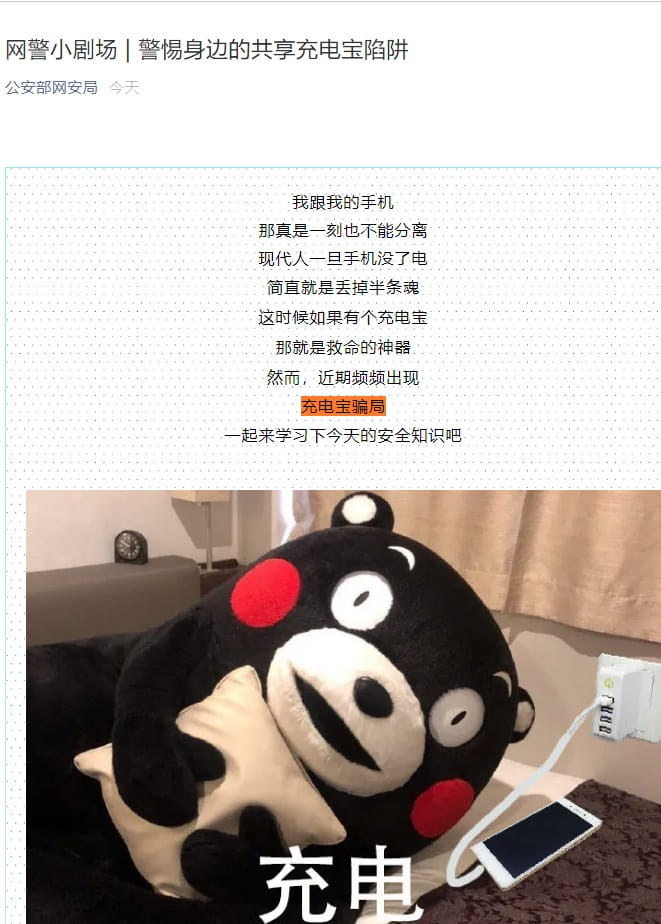 公安部网安局官方微信今日发布了一则重要提醒:你常使用的共享充电宝可能被植入木马程序,一旦插入手机,可能就会盗取你的个人信息。哪些充电宝可能存在安全隐患呢?一是商场里的可租赁移动电源,二是火车站里叫卖的满电充电宝,三是扫码免费送的充电宝。警方提示,不要随意领取和购买来历不明的移动电源,连接移动电源时,如弹出是否“信任”提示,请保持警惕。