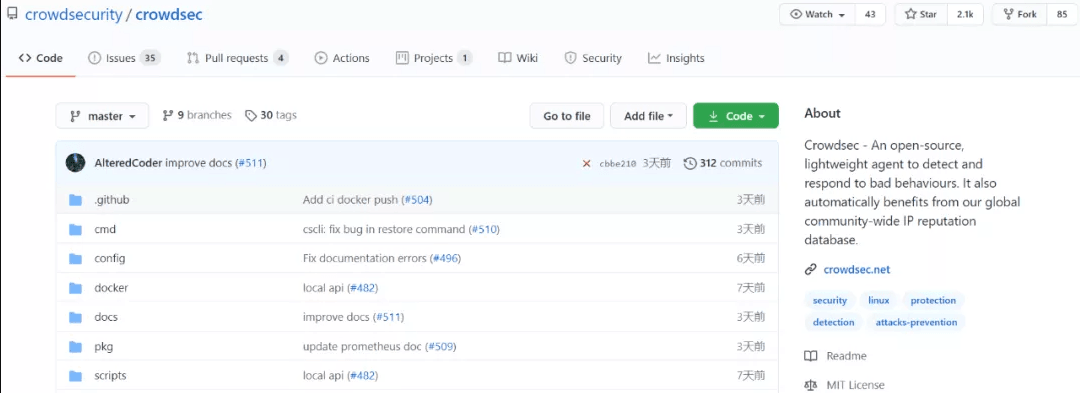 目前,crowdsec已经在Github上标星 2.1K,累计分支 85 个。