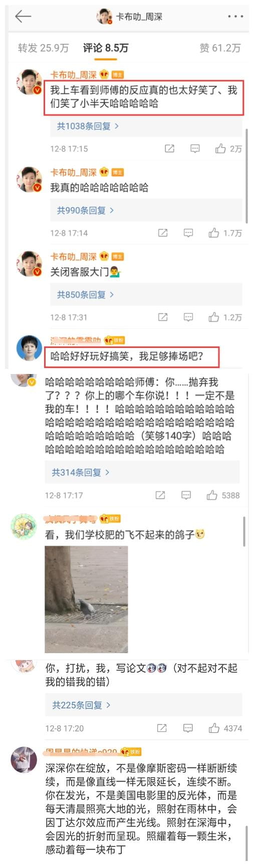 在评论区周深依旧沉浸在那个事件当中,他说:“我上车看到师傅的反应真的也太好笑了,我们笑了小半天,哈哈哈,关闭客服大门!”这件事情对于司机先生来说,的确是很恐怖的,稀疏的日常秒变拍鬼片,当司机还得心脏坚强,扛得住吓,不得真的坚持不下去,看到这里就想起了以前有人在殡仪馆工作,结果大晚上的肚子饿了,就点了外卖,外卖小哥看到这地址内心一惊,吓得哆嗦。