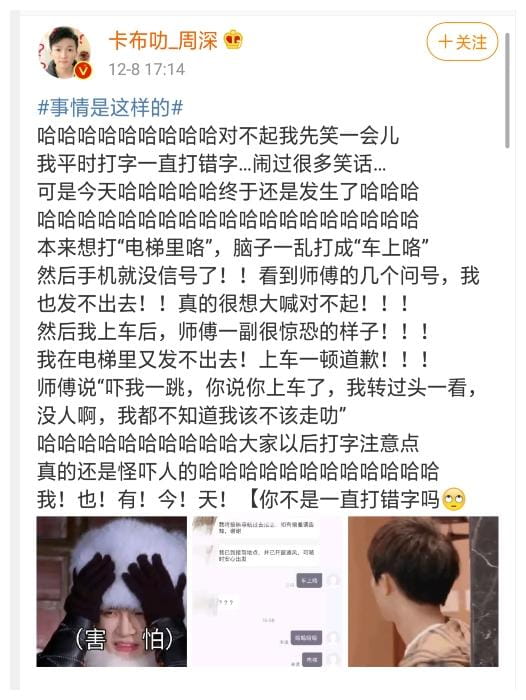 周深依旧行走在搞笑的路上,感觉比起一个歌手,周深似乎更擅长于做一个喜剧人,周深分享了今日发生在他身上的故事,他表示自己平时就常常打错字,也因此闹过很多笑话,结果今天也发生了一个乌龙,周深:“本来想打‘电梯里咯’,打成了‘车上咯’,手机没信号了,看到师傅发来的几个问号,我也发不出去,上车后师傅一副很惊恐的样子,师傅说:‘吓我一跳,你说你上车了,我转过头一看,没人啊,我都不知道我该不该走!’,“最后周深以过来人的身份提醒大家:”大家以后打字注意点,真的还是怪吓人的。”