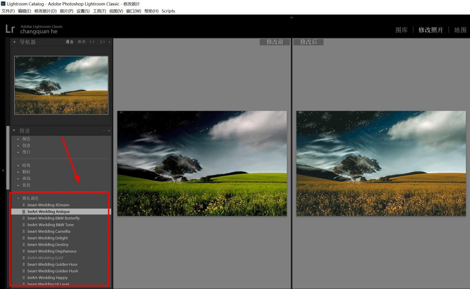 以“30款婚礼调色”这个预设文件夹为例,放置到Develop Presets文件夹里,重启LR,在预设栏即可看到婚礼调色,直接点击就可以使用了,如图所示: