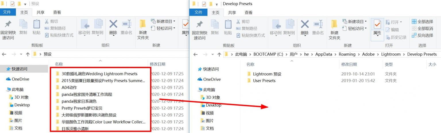 我们再把下载的预设解压后,复制粘贴到Develop Presets文件夹里即可,如图所示:
