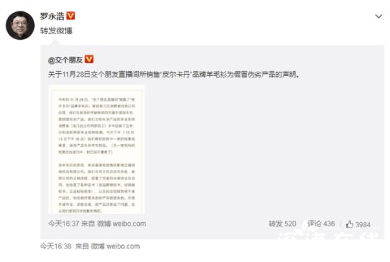 15日,#罗永浩直播间所售羊毛衫为假货#引发关注。据媒体报导,罗永浩直播带货微博“交个伴侣”发布《关于11月28日交个伴侣直播间所销售“皮尔卡丹”品牌羊毛衫为假货的声明》,承认所售出部分羊毛衫为假货。