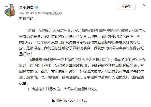 据河南省郑州市金水区法院官方微博消息,金水区法院16日就对一名九岁儿童采取限制高消费的执行措施发布一则致歉声明,声明如下: