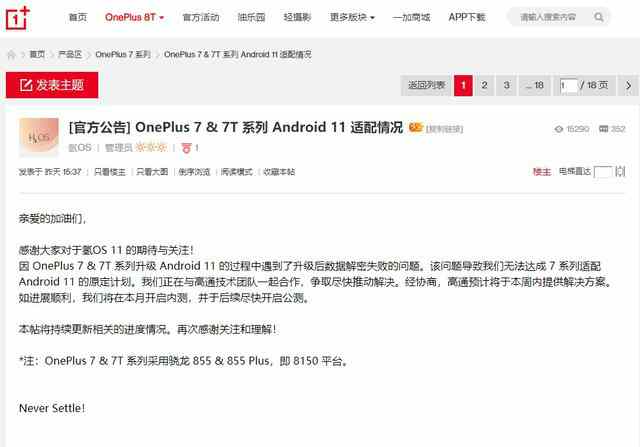 一加论坛昨天发布了 OnePlus 7 & 7T 系列 Android 11 适配情况官方公告,其中表示,因 OnePlus 7 & 7T 系列升级 Android 11 的过程中遇到升级后数据解密失败的问题。该问题导致无法达成一加 7 系列适配 Android 11 的原定计划。